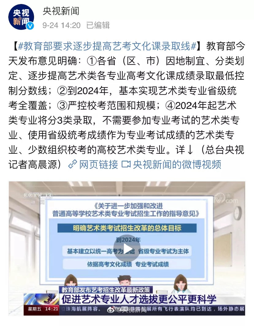 2021年09月24日,教育部发布《关于进一步加强和改进普通高等学校艺术类专业考试招生工作的指导意见》,明确要求逐步提高艺考文化课录取线。